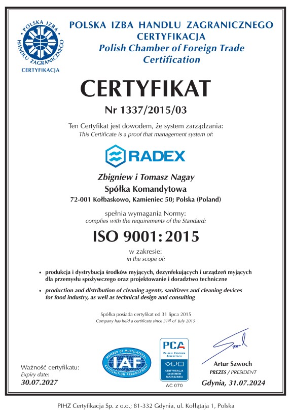 Potwierdzenie ich satysfakcji oraz wysokiej jakości świadczonych usług stanowią liczne referencje pozyskane przez RADEX podczas całego okresu swojej działalności. Jednak nie tylko klienci firmy potwierdzają jej wysoki poziom. Jest on również weryfikowany przez niezależne podmioty, które przeprowadzają coroczne audyty. O ich pozytywnych wynikach świadczą liczne certyfikaty, które posiadamy.